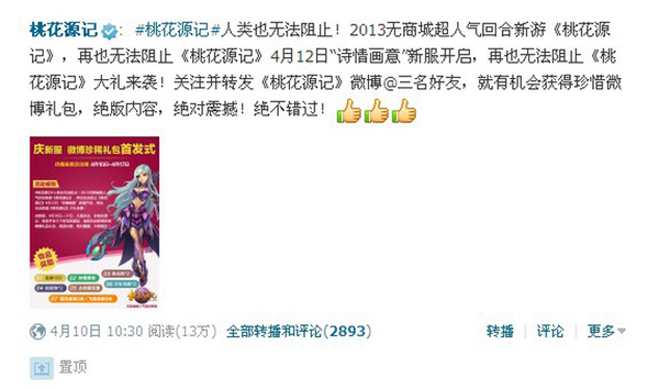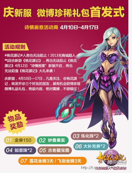 《桃花源记》的微博粉丝数已经超过15万,而且难得的事《桃花源记》的微博粉丝是极少僵尸粉的,他们都是喜欢《桃花源记》才关注的,一直以来微博都是《桃花源记》与玩家沟通的重要通道,所以,为了回馈玩家对《桃花源记》微博的支持,特别首次推出微博极品礼包。而“诗情画意”开服当日,也成为微博极品礼包的首发仪式,玩家热情高涨,活动火爆进行中。
