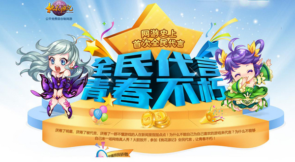 网游代言一向主打大牌明星,并且不知从什么时候开始,代言明星没有大牌,只有更大牌!然而,“Nothing is impossible”, 2013年一款名为《桃花源记》的网游挑战这种传统模式,,其全民代言或刮起网游代言新旋风。