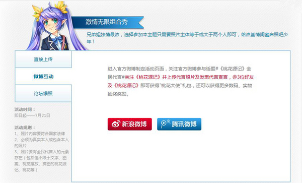 《桃花源记》全民代言官网、论坛、微博同时进行,门槛低! 这种代言形式,没有某选秀代言的层层关卡,参与的玩家只需登录相关页面,上传代言照片并发表代言心声,就可以为自己喜欢的网游代言,告别被明星代言的时代。