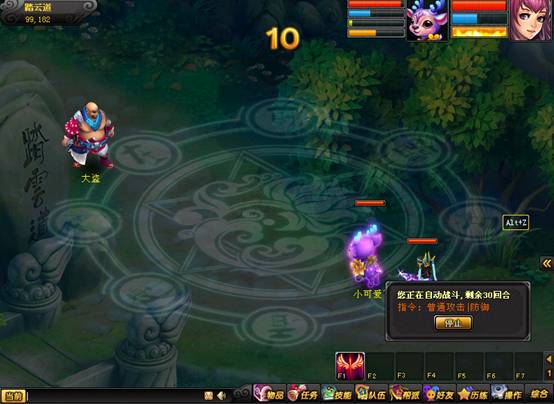 在战斗中点击战斗指令界面中的“自动”按钮,即可开启自动战斗,自动战斗以上一回合的操作为准,持续30回合,点击游戏主界面的“停止”按钮可以手动取消自动战斗。收服快捷键:ALT﹢Z