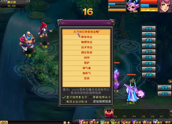在组队战斗中点击战斗辅助指令界面的“指挥”按钮,即可打开战斗指挥界面,选择一条指挥命令然后左键单击选中的目标,即可将指挥命令标注在目标身上,方便队友配合。