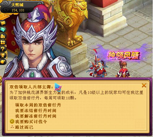 玩家每周可在天熙城“兵部主簿”(149,100)处领取10颗双倍修行丹,每使用1颗双倍修行丹可获得1小时的双倍经验时间。