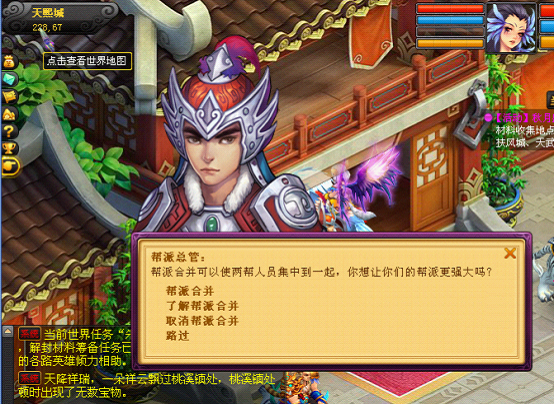 1.首次申请帮派合并后,需在24小时后组队前往帮派总管处,再次点击帮派合并进行合并;