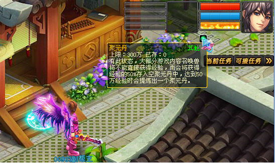 通过跟npc交易获得“空聚元丹”,人物使用后便携带“聚元丹”buff,有此buff的状态下,召唤兽在平常升级中将不能再获得经验,而是将获得的经验的50%存入其中,当存满50万经验的时候即可生成一颗“聚元丹”。