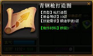 以下为10级青钢枪的武器打造图,按照打造图给出的技能需要和制作材料的提示,玩家打造武器会变得很容易。