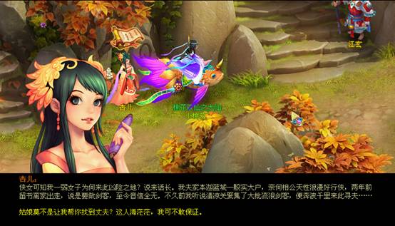 向霸气剑客打听是否认识其夫柳闻松,霸气剑客称如果你能帮他拿回自家祖传令牌,他就告诉你柳闻松的去向。霸气剑客所指之人却是你的童年好友简不繁,他拜在纤阿教门下正替本教挑选门徒,而令牌是可加入纤阿教的凭证。你惩罚了哄骗你的霸气剑客,他这才说出柳闻松获得了纤阿教令牌,上山入教去了,于是你沿路去追柳闻松。