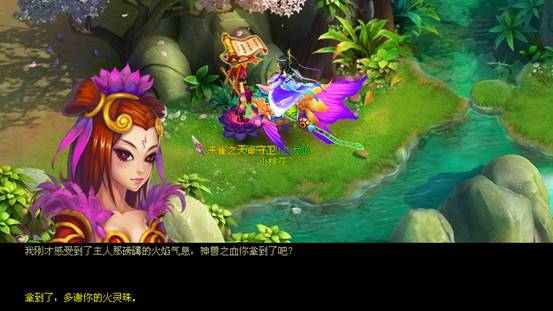可是锦岚姑娘暂时没心思帮助你,原来飞流山最近来了只凶恶的妖魔打伤了很多白猿,奇怪的是,虽然那些白猿都受伤了,但却无一死亡。这事儿有蹊跷!你问过白猿首领后,得知这妖魔神出鬼没难觅踪迹,也许这妖魔喜欢附身在人类的身上,于是你和飞流山上的人们一一交谈,哈哈,稍微一试探就发现妖魔了。被识破的妖魔向北部逃窜,追上去发现 “妖魔”竟是神兽朱雀的天命守卫,她担心附近的怪物会伤害到主人才驱赶那些白猿。向她说明需要修复伏魔大阵之事,天命守卫让你带着火灵珠唤醒她的主人。